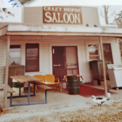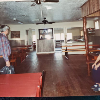 The Crazy Horse Saloon was the very first building to be moved into Salmon Lake by Floyd Salmon in 1976. Originally, it was a grocery store located in Mapleton, Texas. One day in 1976, Floyd received a phone call from the owner of the building, telling him that a truck had run into the building, knocking it off its blocks. They asked if he would like to have it, and of course he did! After moving it to the park, he made necessary repairs and remodeled it to resemble a Saloon. The four tables were made by Floyd Salmon, Jake Salmon, Tracy Salmon and Mike Cryer where the names of their families were carved along with the other characters you see on the table tops. The lady painted on the floor of the Saloon was a singer that Floyd Salmon once knew. The bar top was also painted by Floyd Salmon. He was truly a crafted artist! The Saloon is currently used as a reunion hall and seats around 55 people!